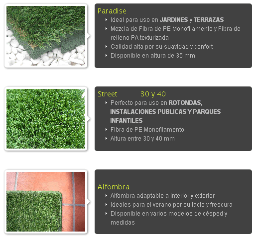La tendencia actual de Ayuntamientos y Organismos Públicos o privados por cuidado estético de jardines, rotondas, plazas y paseos, así como determinadas actividades deportivas, ha permitido el desarrollo de los céspedes artificiales con acabados muy similares a los reales, pero con las ventajas de escaso mantenimiento y riego de los céspedes artificiales.