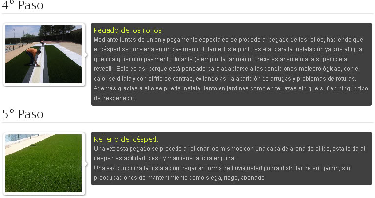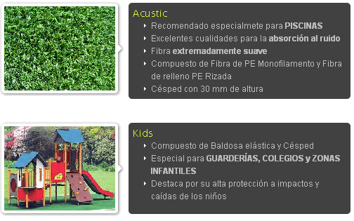 Es un césped decorativo alta calidad, con una sensación de suavidad muy cercana a la del césped natural. Dicho césped no necesita un cuidado muy especial, únicamente un cepillado y limpiado cada mes.