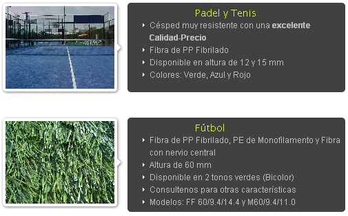 Con respecto a sus características técnicas, la fibra utilizada es monofilamento lubrificado monocolor y/o bicolor según modelo con altura desde 12 a 35mm y con una densidad desde 15.750 a 25.200 puntadas m2. Su comercialización se distribuye en rollos de 1x4, 2x4, 2x25 y 4x25 mts.